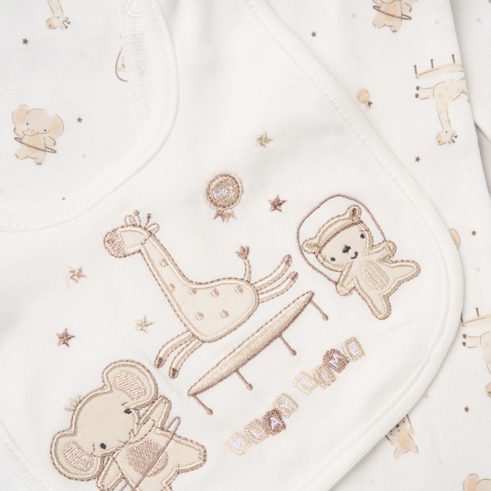 Description : 6 Piece net bag gift set including Bib, Bodyvest, Hat, Sleepsuit, Mittens and Gift Bag