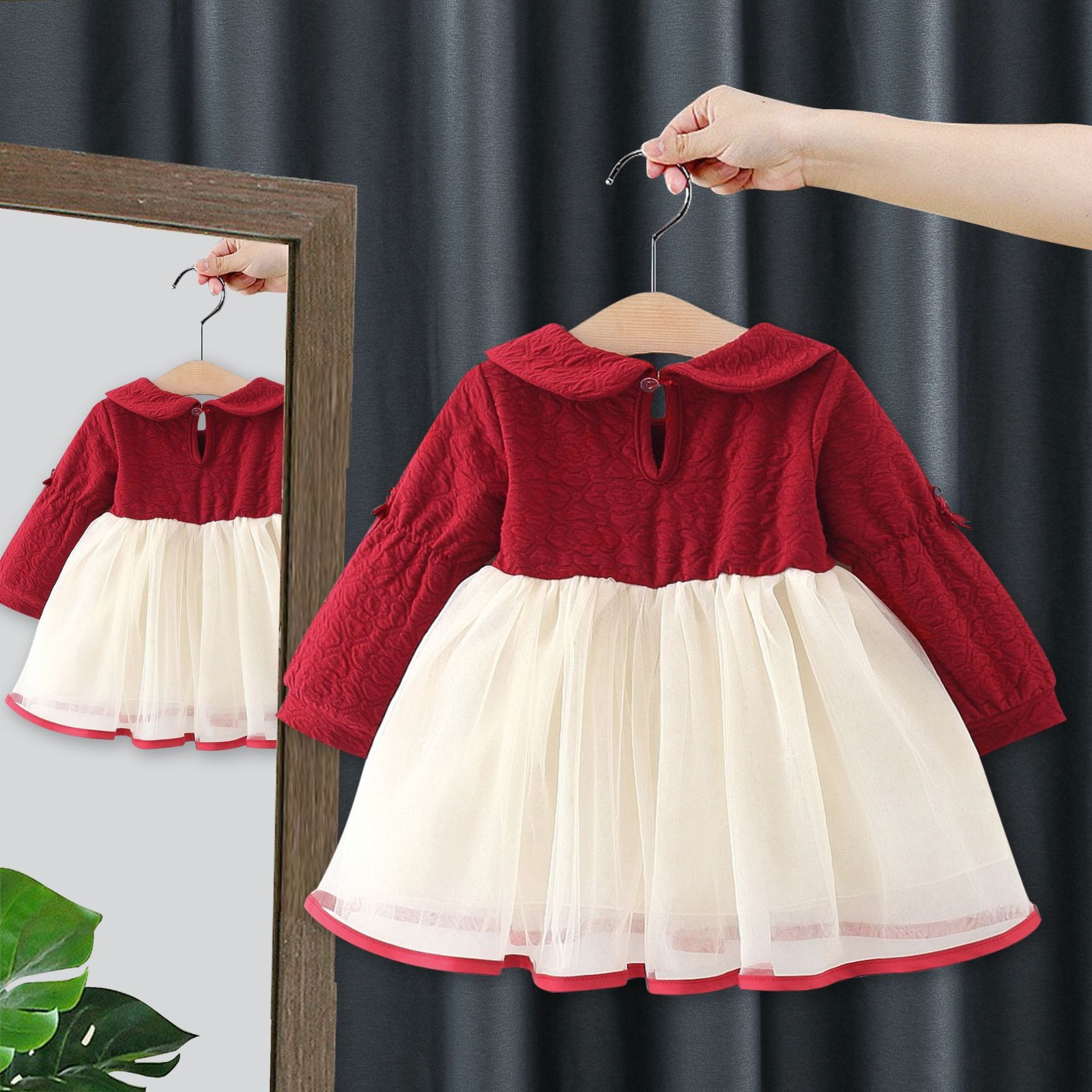 The dress features a red top with a large bow decoration at the waist and a white, ruffled A-line skirt. It has long sleeves and a round neck.